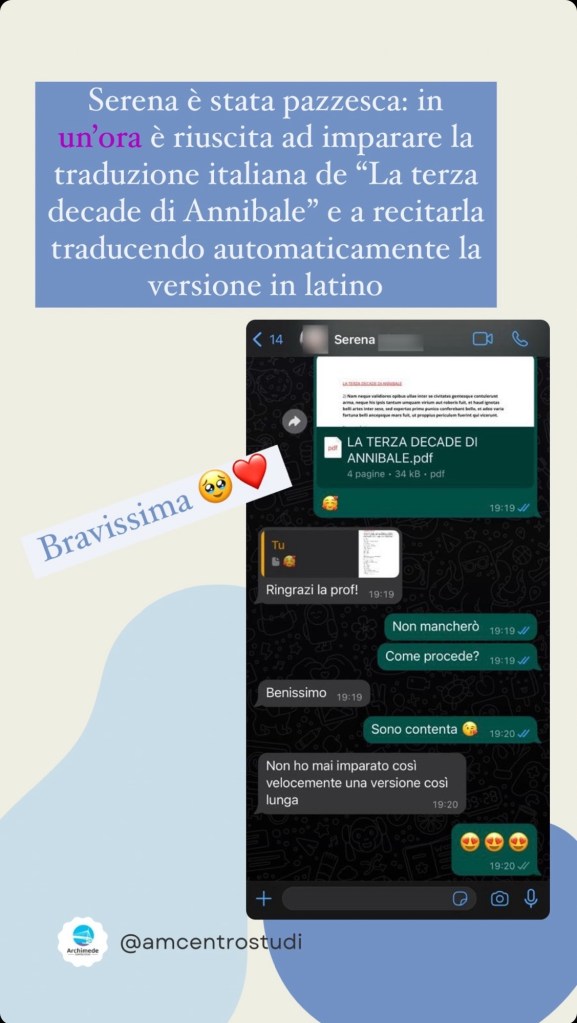 Ringrazi la prof, procede benissimo e non ho mai imparato così velocemente una versione così lunga! All’interrogazione ho preso 8 e mezzo.
